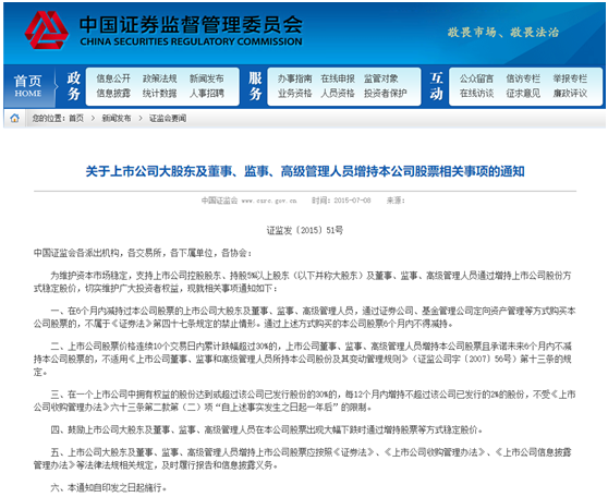 面对股价的普遍剧烈调整,2015年7月8日,证监会发布《关于上市公司大股东及董事、监事、高级管理人员增持本公司股票相关事项的通知》,支持上市公司控股股东、持股5%以上股东及董事、监事、高级管理人员通过增持上市公司股份方式稳定股价。