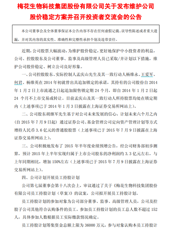 随后,数量众多的A股上市公司发布维护股价稳定的公告,梅花生物也是其中之一。