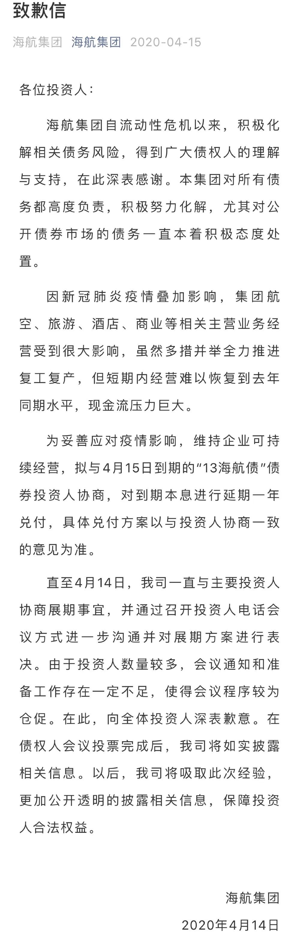 4月15日凌晨,海航集团深夜通过微信公众号发布《致歉信》,对当日到期的“13海航债”展期相关事宜致歉。