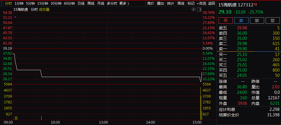 今日,兄弟债券“15海航债”遭到市场抛售,盘中两次临时停牌,盘中一度跌近40%,截至收盘,15海航债大跌25.75%,报价29.1元。