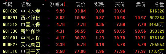 保险板块今日盘中再度大幅拉升,截至收盘,中国人寿涨停,西水股份大涨近9%,中国人保、新华保险、中国太保等涨幅超4%。