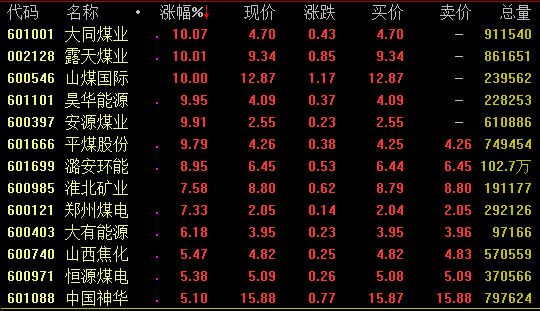 煤炭板块今日盘中爆发,个股集体拉升,截至收盘,大同煤业、露天煤业、山煤国际、昊华能源、安源煤业等涨停,平煤股份逼近涨停,潞安环能换涨近9%。