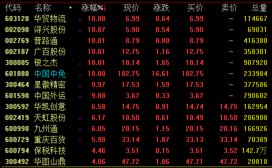 跨境电商概念今日盘中走势活跃,截至收盘,华贸物流、浔兴股份、普路通、广百股份、银之杰、中国中免、星微精密、中国外运等涨停,华凯创意、天虹股份、九州通等涨幅超6%。