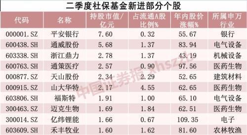 值得注意的是,社保基金二季度新进39只个股。其中新进持仓市值最大的是平安银行,社保基金104组合大举买入5516.94万股平安银行,二季度末持股市值7.60亿元。