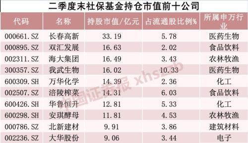 社保持仓市值前十大个股中,持仓市值最大的是长春高新(000661)。二季度末社保基金持有长春高新981.91万股,持仓市值达到33.19亿元,占其流通股比例为5.78%。