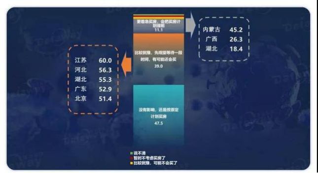 根据零点有数的报告,97.6%的已有购房计划的消费者不会因为疫情影响而取消购房计划,其中47.5%预计按原定计划购房,39.0%会选择先观望但还会买,11.1%在经历疫情后希望提前购房,拥有自己稳定的居所