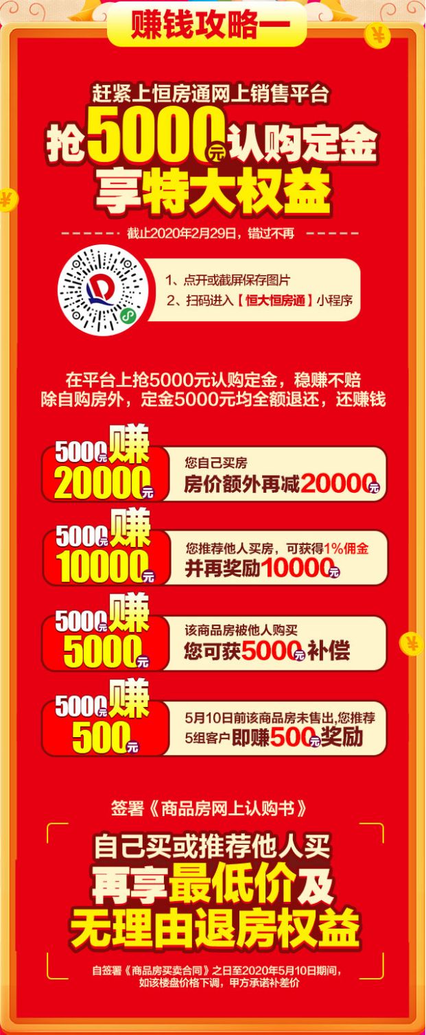 值得注意的是,从恒大的宣传资料可以看到,这5000元买房定金,如若未成功购买,将全额退款。如若成功购买,则还能享受20000元的额外优惠。此外,推荐他人购买、第三方购买等情况还有一系列奖励。