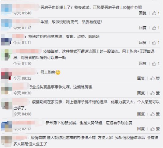 对于恒大这一网上购房+无理由退房的创新模式,网友纷纷表示,疫情当前,这种模式可谓逆流而上的一股清流。