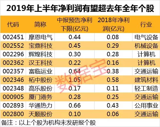 随着中报预告的披露,部分未获机构关注股的中期业绩也浮出水面。数据宝统计显示,10股今年中期净利润有望超越去年全年(净利润下限,2018年度盈利),包括摩恩电气、宝鼎科技、辉煌科技等。