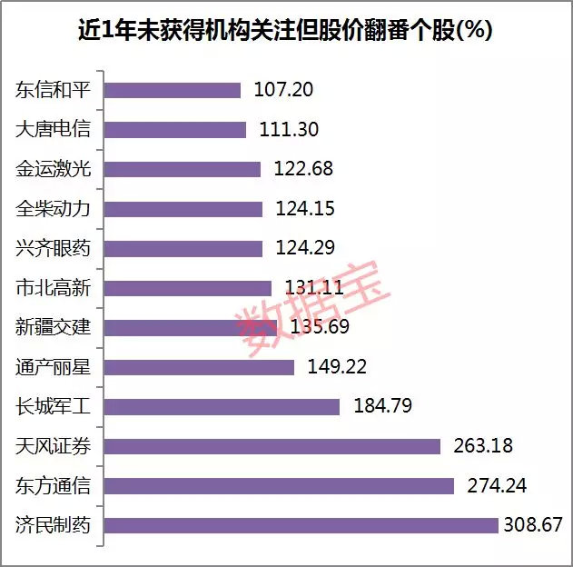 未获得机构关注的股票,也并不一定市场表现就差。数据宝统计显示,267股近1年逆势上涨,12股涨幅翻番,济民制药、东方通信、天风证券涨幅位居前三名,股价分别上涨308.67%、274.24%、263.18%;另外,新疆交建、市北高新、兴齐眼药股价涨幅也超过100%。
