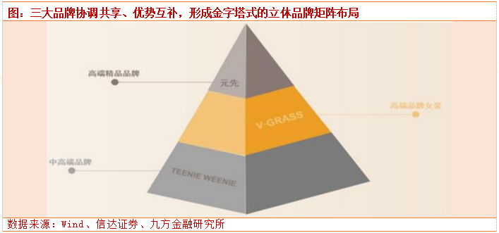目前公司旗下三个自有品牌包括中高端定位的新复古学院风格的标志性品牌 TEENIE WEENIE、中高端女装领导品牌 VGRASS 和具有 中国文化元素特征的高端精品品牌元先。TEENIE WEENIE 品牌融合韩国元素的独特风格, 在亚洲具有很高的品牌知名度;VGRASS 作为公司主品牌,专注“时尚、修身”DNA,秉 持工匠精神,打造中国高端女装一线品牌;品牌元先定位为奢侈品,采用高端定制化服务, 通过资源整合、跨界艺术合作等方式重现中国风奢侈品的品牌价值, 三大品牌协调共享、优势互补,形成金字塔式的立体品牌矩阵布局。