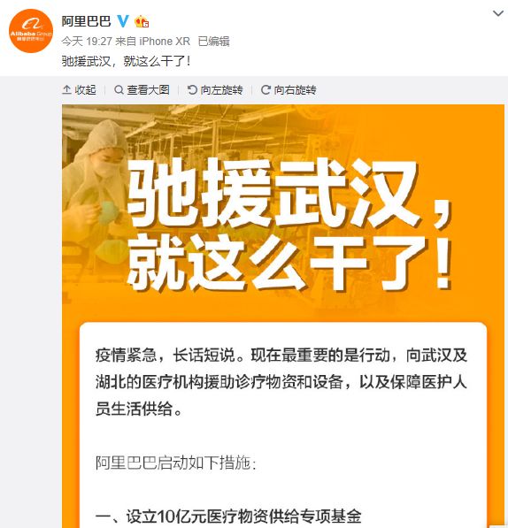 1月25日晚间,阿里巴巴宣布:设立10亿元医疗物资供给专项基金,从海内外直接采购医疗物资,定点送往武汉及湖北的医院。