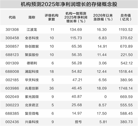 证券时报·数据宝根据5家及以上机构一致预测数据,12只存储器概念股预计2025年度实现净利润同比增长或扭亏,其中江波龙、全志科技预测净利润增幅超100%,龙头股兆易创新、澜起科技预测净利润增幅在40%以上。