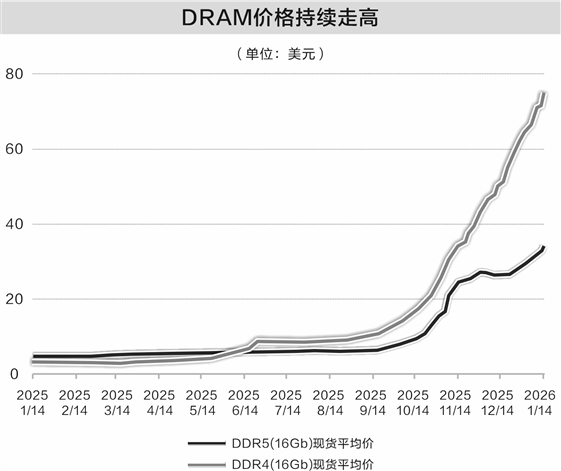 2025年以来,全球存储市场步入一轮强劲的涨价周期。Wind数据显示,DRAM(动态随机存取内存)方面,DDR5(16Gb)1月14日报价34.08美元,较去年年初的4.68美元上涨627.79%;DDR4(16Gb)报价75美元,较去年年初的3.19美元涨幅更是达到2252.57%。NAND Flash(闪存)方面,64G闪存产品最新报价7.113美元,较2025年年初上涨超60%。