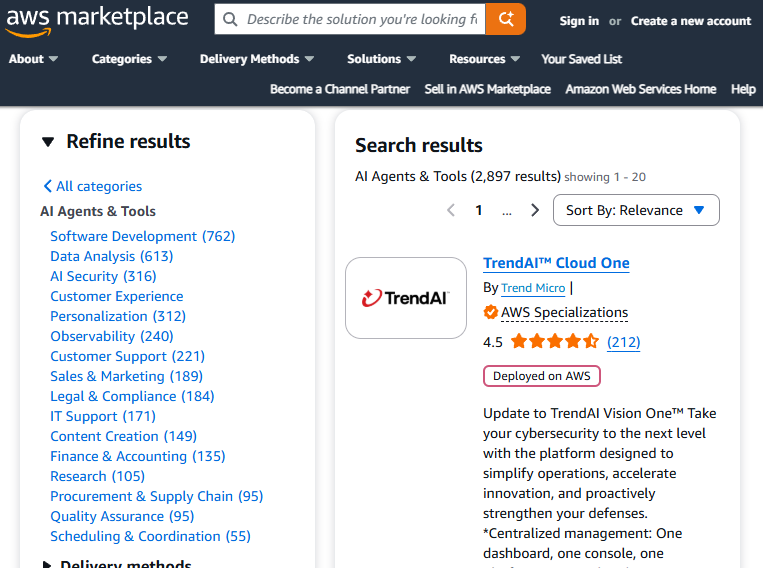 在亚马逊的AWS Marketplace中,客户可以购买近上万个人工智能代理和工具,类别涵盖软件开发、数据分析、法律顾问、财务会计、市场营销等。
