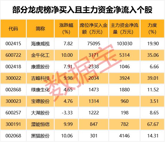 从盘口资金流向来看,主力资金净流入超千万且龙虎榜净买入个股共有6只,其中海康威视、金牛化工、黑猫股份等个股资金净流入金额最大。净流入力度最大的个股有潜能恒信、吉峰科技、金牛化工,净流入力度分别为67.67%、39.01%、35.06%。