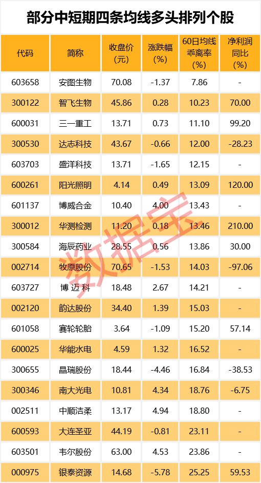 截至7月22日,26只个股5日、10日、20日、60日四条均线近日呈多头排列。其中安图生物、智飞生物、三一重工股价与60日均线的乖离率最小,分别为7.86%、10.23%、11.10%。