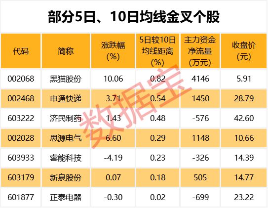 截至7月22日收盘,有7只A股的5日均线主动上穿10日均线,其中黑猫股份、申通快递、济民制药等个股的5日均线较10日均线距离最大,分别达0.82%、0.54%、0.48%。