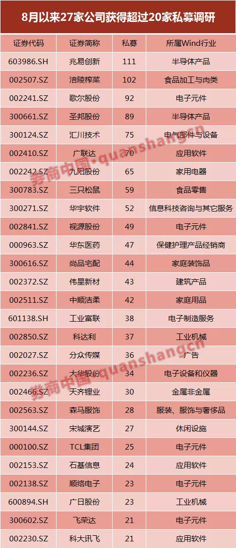 Wind数据显示,8月以来,共有212家公司获得了私募机构的调研。其中,61家上市公司获得超过10家以上私募的集中调研,27家上市公司则获得了20家以上私募调研。