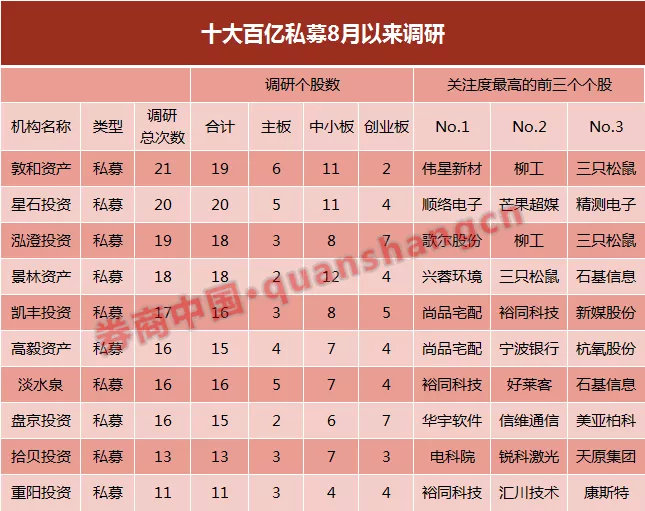 8月以来,百亿私募的调研热情高涨,密集调研个股。其中,敦和资产、星石投资是近一个多月调研“最勤奋”的百亿私募,调研次数均超过20次。而景林、凯丰、高毅、淡水泉等百亿私募的调研次数也均超过15次。