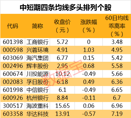 截至最新收盘,143只个股5日、10日、20日、60日四条均线近日呈多头排列。其中工商银行、兴蓉环境、海汽集团股价与60日均线的乖离率最小,分别为3.48%、4.95%、5.42%。