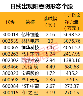 15股阳吞阴形态亿纬锂能等主力资金流入