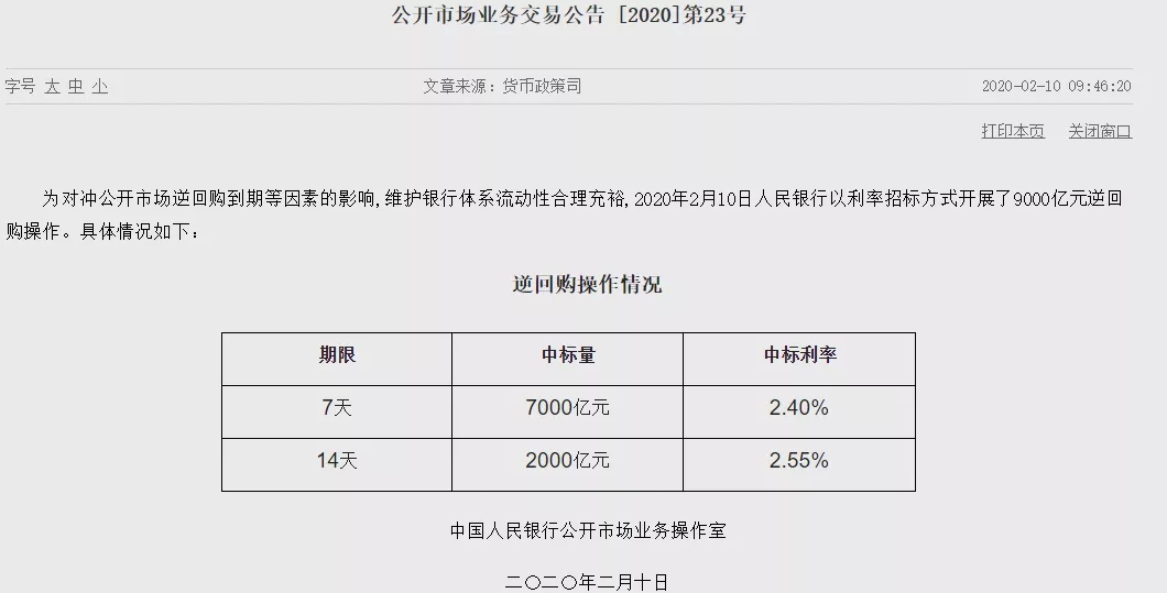 央行开展9000亿逆回购操作