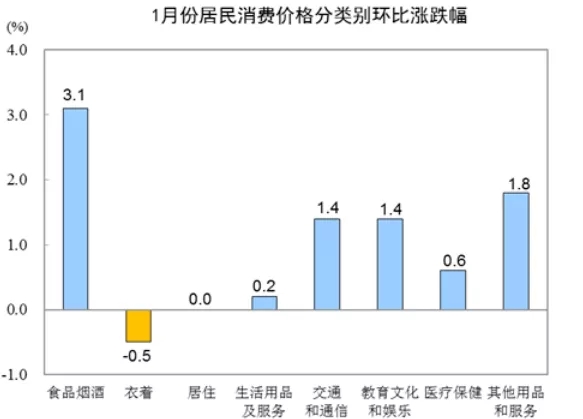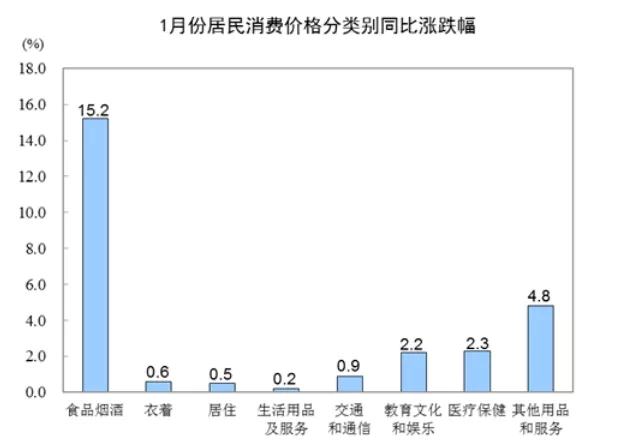 非食品中,医疗保健、教育文化和娱乐、交通和通信价格分别上涨2.3%、2.2%和0.9%。扣除食品和能源价格的核心CPI同比上涨1.5%,涨幅比上月扩大0.1个百分点。据统计局测算,在1月份5.4%的同比涨幅中,去年价格变动的翘尾影响约为4.0个百分点,新涨价影响约为1.4个百分点。