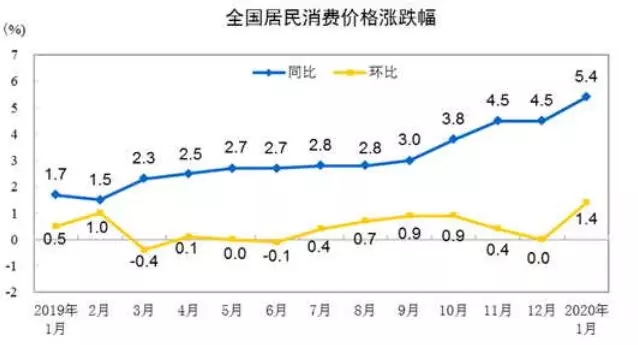 周一早上,国家统计局公布1月经济数据。数据显示,2020年1月份,消费者物价指数(CPI)同比上涨5.4%,涨幅较上月上升0.9个百分点,创下2011年11月以来逾8年新高。