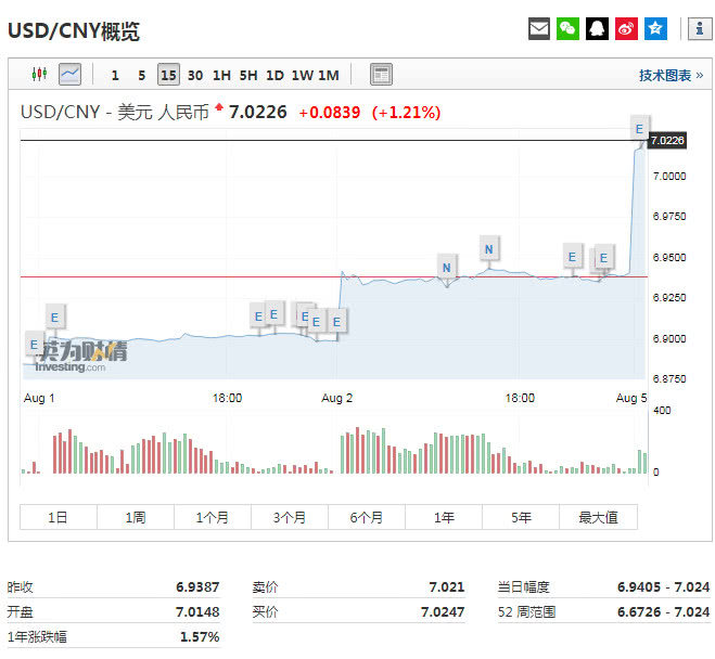 1、8月5日早9点33分,在岸人民币“破七”,报7.0056,此前离岸人民币报7.0803。8月5日,人民币兑美元中间价跌破6.90关口。