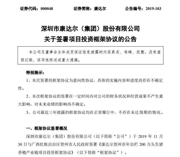 同样拟扩产生猪养殖的公司还包括康达尔。12月1日晚间,公司发布公告,公司于11月30日与广西贺州市政府签署投资框架协议,拟投建康达尔贺州市年出栏200万头生猪养殖产业链项目,项目计划总投资约60亿元。
