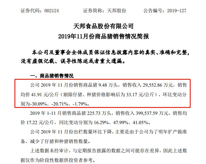 在12月1日晚间最新公告中,天邦股份也明确表示,公司2019年1-11月商品猪销售收入39.95亿元,同比变动47.99%。