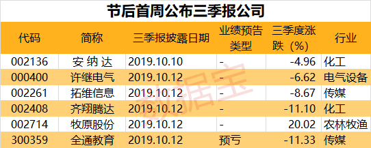 根据深沪交易所三季报预约披露时间表,节后首周也就是本周将有6家公司三季报率先亮相,均为深市公司,主板及创业板各有1家,其中主板是许继电气,创业板是全通教育,都将在10月12日公布三季报,中小板则有4家公司,安纳达10月10日公布,不仅是首家公布三季报的中小板公司,也是两市首家公布三季报的公司。沪市三季报“首秀”则在下周,即格力地产、九华旅游,均在10月15日公布三季报。