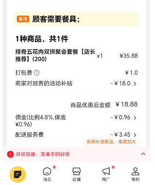 以7月13日一笔35.88元的外卖订单为例,扣除18元的商家补贴,0.96元的平台佣金,以及3.45元的配送服务费后,阿文实际收入仅14.47元,实收率40%。