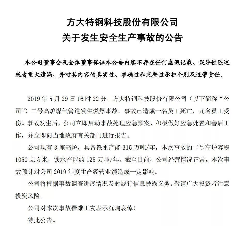 事件突发,昨夜方大特钢公司紧急开会,并且也在深夜进行了公告。