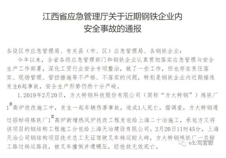 江西省应急管理厅官方网站上月底发布的关于近期钢铁企业内安全事故的通报显示,“钢铁企业内近期接连发生6起事故,安全生产形势仍然十分严峻。”涉事企业就包括方大特钢。