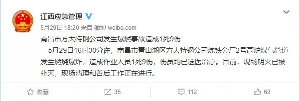 5月29日下午16时22分,A股公司方大特钢位于江西省南昌市青山湖区的炼铁分厂的厂区内发生高炉燃爆,事故已造成一名员工死亡,九名员工受伤。