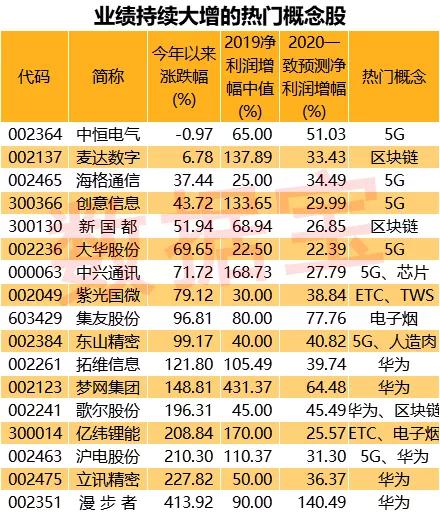 数据宝统计显示,上述热门概念股中,2019年预告净利润增幅中值超20%,且2020年机构一致预测净利润有望同比增长20%以上的公司共有17只。