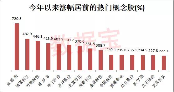 值得一提的是,涉及热门概念较多的鹏鼎控股、卫士通,前者股价涨1.56倍,后者股价上涨45.19%。