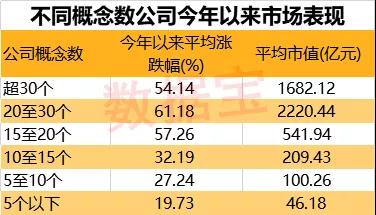 概念数超30个的上市公司平均市值超1600亿,概念数在20个至30个的上市公司平均市值超过2000亿;而概念数在5个以下的公司平均市值不到50亿。结合市场表现来看,概念数在20个至30个的公司今年以来平均涨幅超60%;其次是有15个至20个概念的公司,平均上涨55%以上,而超30个的上市公司平均涨幅也超过50%。相比之下,概念数在5个以下的公司平均涨幅不到20%。