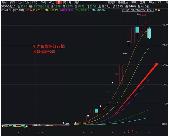 另一只热门股引力传媒股价涨幅同样刺激。从12月13日至今,股价从8.03元涨至最高24.68元,股价翻涨超3倍。据悉,引力传媒是一家以数字营销为主营业务的公司,2019年四季度开始布局短视频商业化和MCN营业业务。