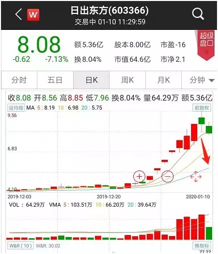 1月9日,连续拉出多个涨停板的日出东方开始出现炸板。1月10日,日出东方股价继续下跌,截至当日午盘收盘,股价报收8.08元。而在网红行情背后,日出东方超5000万理财产品的爆雷事件也引起了市场的关注。