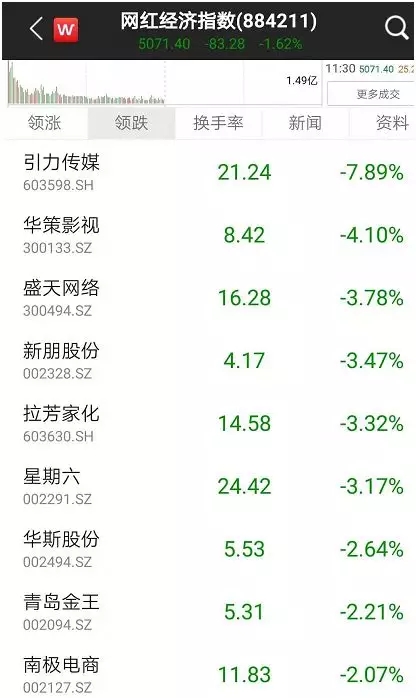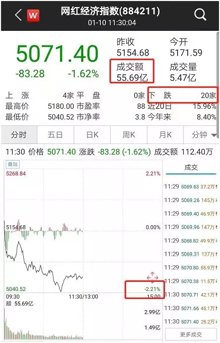 1月10日早盘,网红经济指数低开低走,指数跌幅较深,盘中最深跌幅超2%以上。板块内多达20家概念股下跌,仅有4家概念股勉强收红。截至午盘收盘,网红经济指数为5071.40,指数跌幅超1.62%。