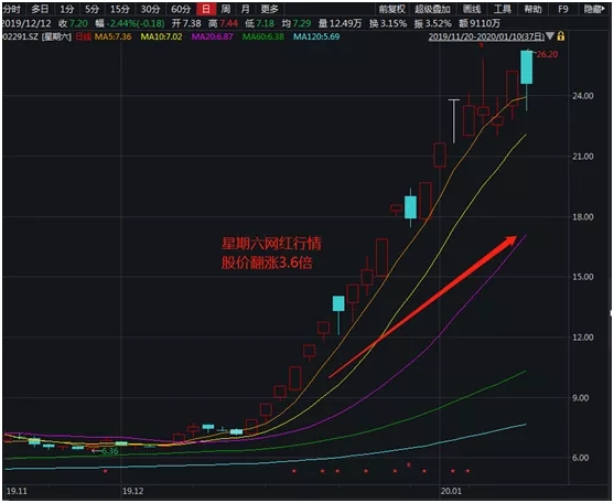 从12月13日开始,星期六股价连续拉出十多个涨停板,股价从前期7.2元一路上涨至最高26.20元,股价翻涨3.6倍。据悉,星期六旗下子公司遥望网络是运营网红直播的MCN机构,在行业排名相对靠前。