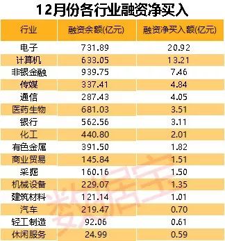 证券时报·数据宝统计显示,分行业来看,在28个申万行业中19个都是融资净买入。其中电子行业净买入20.92亿元,流入的杠杆资金最多;次之为计算机行业,融资净买入13.21亿元;净买入较多的还有非银金融、传媒、通信,融资净买入额都超过了4亿元。