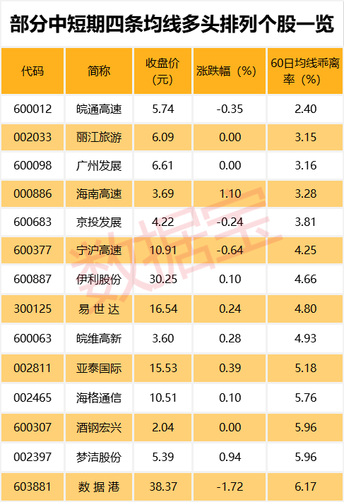 一般来说,均线多头排列代表买方力量强大,后市由多方主导行情概率较大。107只个股5日、10日、20日、60日四条均线近日呈多头排列。其中皖通高速、丽江旅游、广州发展股价与60日均线的乖离率最小,分别为2.40%、3.15%、3.16%。