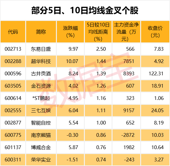 最新数据显示,有108只A股的5日均线主动上穿10日均线,其中东易日盛、超华科技、古井贡酒等个股的5日均线较10日均线距离最大,分别达2.50%、1.44%、1.39%。