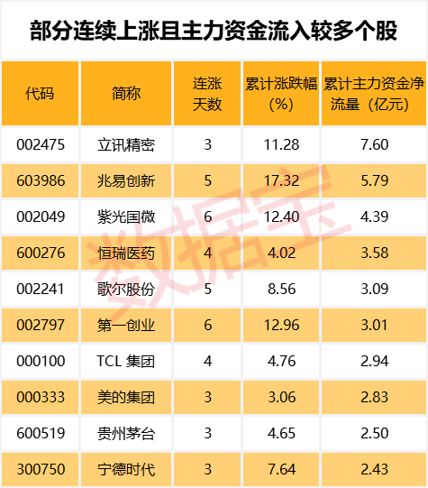 值得注意的是,816只连续上涨个股中,28只个股期间主力资金累计净流入超过亿元。其中,累计资金流入最多的为立讯精密,主力资金累计流入7.60亿元。