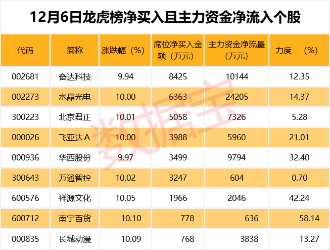 从盘口资金流向来看,主力资金净流入超千万且龙虎榜净买入个股共有7只,其中水晶光电、奋达科技、华西股份等个股资金净流入金额最大。净流入力度最大的个股有南宁百货、祥源文化、华西股份,净流入力度分别为58.14%、42.24%、32.40%。