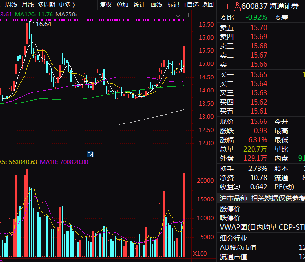 另一大型券商海通证券大涨6.31%,全天成交34亿元。